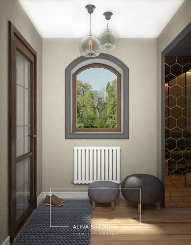 Владельцы загородного дома не нуждались в полном дизайн-проекте, было желание изменить прихожую и тем самым оъеденить 2 совершенно разных стилевых направления в комнатах первого этажа: современная кухня и классическая гостиная. Стена округлой конфигурации становится центром композиции. Графический рисунок, расположенный на ней, выполнен в трафаретной технике. Гипсокартоновая конструкция с нишей для скрытой подсветки дополняют и подчеркивают мягкие формы объекта. Помимо этого округлые формы присутствуют в мягких пуфах, а зеркала "соты" в одном из дверных проемов, дополняют графику на стене. Арочные окна прихожей, благодаря обрамлению классическими молдингами, как и в дверных проемах, органично вписываются в пространство интерьера. Материалы: декоративная штукатурка, виниловая плитка, ГКЛ+натяжной потолок, интерьерная краска (молдинги, проемы).
