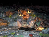 Вода начинает свое путешествие на высоте трех метров. Русло, по которому она с плеском спускается вниз, выложено сланцем. Сама конструкция горки составлена из больших валунов, привезенных из Горного Алтая. Декоративности добавляет сланец серо-зеленых тонов, более мелкие камни того же оттенка, привезенные с Медведского карьера, а также местная галька. Такой микс из камней выглядит весьма привлекательно в любую погоду и при любом освещении. Каменное русло ручья подсвечивают удачно встроенные в конструкцию светильники. Стоит отметить, что система освещения продумана и реализована на всей территории участка.