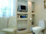 Спустившись по нескольким ступенькам из столовой, можно попасть в помещение гостиной. К слову, назвать его гостиной можно лишь условно, настоящее предназначение этой комнаты – домашний кинотеатр. Углубленное на уровень, без окон, с низкими относительно всего дома потолками, оно вполне подходит для этой цели. Чтобы создать в полуглухом помещении воздухообмен, будущий кинозал снабдили системой климат- контроля. Два уютных кожаных дивана и кресло, расположенные здесь, вместят большое количество гостей. Созданию дружеской комфортной атмосферы способствует мини-бар. Для этого есть все необходимое,подвод воды, охладитель напитков и удобные барные стулья для неторопливой беседы. Зеркальный шар, отбрасывающий многочисленные блики, придает обстановке неформальное клубное настроение.