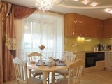 Ванильно-карамельное пространство кухни и гостиной выполнено в современном стиле, который здесь преобладает на классическими элементами в дизайне двухкомнатной квартиры. Рабочая зона кухни с глянцевыми верхними шкафчиками отделена от зоны отдыха тонкой перегородкой, условно обозначающей границы помещений. Каждая деталь в дизайне общественной зоны подобрана с целью сделать пространство невесомым, растворив его границы. Легкие намеки на классику присутствуют в декоре и линиях кухонного гарнитура. Стая бабочек, встретившая нас у входа в квартиру, разлетелась и по этому помещению – они забрались на воздушный натяжной потолок и диванные подушки.