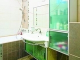 «Хозяйская» ванная комната оформлена более сдержанно. Однотонный кафель пола и стен здесь разбавлен лишь мозаикой и бордюрами. Просторные шкафчики за матовым стеклом дверей позволяют поместить всю необходимую косметику и бытовую химию.