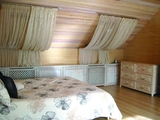 При разработке проекта спальни дизайнеры максимально старалась сделать ее экологически чистой. Во-первых, потому, что это комната, которая должна организовывать здоровый сон, а во-вторых, потому, что спальня располагается прямо над гаражом. Так как из гаража могут быть вредные проникновения, особое внимание уделялось отделочным материалам, и помимо качественной гидроизоляции и пароизоляции, здесь был применен массив дерева. Так, на полу лежит беленая и лакированная лиственница, а на потолке и стенах, поскольку это мансардный этаж, – вагонка из беленого кедра. Кровать и комод также изготовили специально для этого интерьера из натурального дерева. На остальных же стенах – обои из соломки, а в качестве покрытия веранды – местный камень скальной породы. Получился этакий экологически чистый рай, где и дышать легко, и ничего лишнего не раздражает глаз.