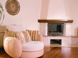 Интерьер первого этажа отличается общим единством, причем не только стилистическим, но и пространственным. Отдельные функциональные зоны здесь сообщаются друг с другом по студийному типу, разделяясь лишь границей напольного покрытия. В прихожей и кухне это светлая керамическая плитка (для большего удобства дополненная системой «теплый пол»), а в гостиной – специальное покрытие, которое только выглядит как обычный паркет, а на самом деле представляет собой трехмиллиметровую пробку, покрытую шпоном из вишни. Она сочетает в себе сразу несколько важных качеств: имеет эстетически красивый внешний вид, она экологически безопасна и, что особенно актуально для семьи, в которой растут дети, защищает от вредного воздействий геопатогенных зон.