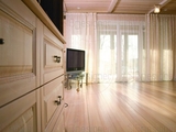 Для старшей дочери был выделен весь третий этаж. Спальную зону рядом с гардеробной отделили от остального пространства легкими занавесями из нежно-зеленой кисеи. Но сейчас старшая дочь уже отселилась от родителей, и поэтому, пока средняя не подрастет, папа занимает это огромное помещение под тренажерный зал.