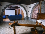 Цокольный этаж занимает грандиозная зона отдыха. Здесь есть и кинозал, и бар для проведения шумных и веселых вечеринок. Оформление цоколя напоминает дизайн классических пабов, подчеркивающих антураж винных погребов. Искусственный камень на стенах, каминная зона, имитирующая грубую каменную кладку, тяжелая дубовая мебель и искусственно состаренные стены – брутальный образ цокольного этажа как раз для мужской компании хозяина дома.