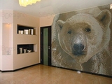 В холле явственно звучит тема Севера, великолепие которого подчёркивается изысканными материалами и аксессуарами. От пола, оформленного керамогранитом светлого оттенка, так и веет прохладой и свежестью. Блеск его поверхности перекликается с глянцевостью белого натяжного потолка, что даёт двойной эффект: поддерживает мотив Севера и визуально расширяет пространство комнаты. Стилистическим акцентом стала шикарная люстра, навевающая ассоциации либо с холодными арктическими льдами, либо с тяжёлыми снеговыми облаками. «Холодную» тему поддерживают и детали – массивные, привлекающие внимание холодным блеском металла вазы, расставленные в нишах. Доминантой помещения стало внушительных размеров мозаичное панно с изображением величественного белого медведя, запечатленного в движении. Он появился здесь не случайно: белый медведь – любимый символ хозяина квартиры. Панно выполняли по индивидуальному заказу, в итоге по своему цветовому решению и тематике оно гармонично вписалось в интерьер.