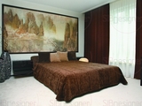 В правой части квартиры расположены спальня и гостевая комната. Эти комнаты выходят на юг, поэтому дизайнер смело использовала в их оформлении холодные оттенки. Колористика спальни полностью выдержана в тонах холла. Однако здесь уже прослеживается иная тема – намёк на Восток. Лаконичная обстановка и строгий цветовой контраст, монохромные фрески с колоритными пейзажами – всё созвучно восточной теме. Атмосфера спальни уютна, способствует отдыху и расслаблению; стоит лишь задвинуть тёмные плотные портьеры – и даже в разгар дня можно надёжно скрыться от солнечных лучей.