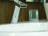 В спальне расположен вход в ванную, дизайн которой созвучен интерьеру комнаты. Здесь также использовались тёмные и светлые оттенки, причём помещение решено плоскостями. Светлые плоскости представлены керамогранитом, имитирующим оникс. Чтобы он заиграл в полную силу, автор оттенила его керамогранитом с грубоватой, словно тронутой ржавчиной поверхностью. Получился эффектный контраст.