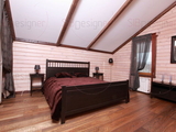 Заглянем на второй этаж, где расположены три спальни. Конструкция крыши внесла свою лепту в интерьер комнат верхнего этажа: потолки здесь высокие, но скошенные. Сложное пространство подчеркнуто контуром из деревянных балок. Стены во всех комнатах обработаны светлой полупрозрачной краской, сквозь которую хорошо видна натуральная фактура древесины.
