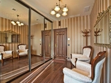 Холл выполняет свое основное функциональное назначение – обеспечивает доступ к другим помещениям. Посетители могут снять здесь пальто, поправить галстук или платье перед входом в кабинет. Холл по традиции украшен ценными вещами, свидетельствующими о солидности хозяина помещения. Клиентов встречает массивная входная дверь, огромный зеркальный шкаф вдоль одной из стен. На другой – большое зеркало в бронзовой раме. Рядом добротные кресла с изогнутыми ножками, украшенные резьбой. Цветовая гамма – сочетание бежевого, темно-коричневого и золотого. От резных люстр исходит теплый, золотистый свет. Потолок традиционно выполнен в светлых тонах, которые плавно переходят в бежевые вертикальные полоски на обоях.