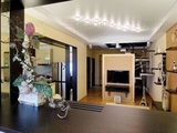 В гостиной внимание приковывает большой угловой диван – удобное место для размещения припозднившихся гостей. Золотистый текстиль и бледно-бежевый цвет стен вносят еще больше света в жизнерадостное пространство. Часть стены оформлена теплым оттенком золотисто-коричневого цвета – на этом фоне выделяются разные декоративные мелочи: ваза и статуэтки, пронизанные тематикой Востока и расставленные на зрительно невесомых полочках, подчеркнутых зеркалами. Географические впечатления продолжает миниатюрная копия Эйфелевой башни на полу. Разные световые сценарии позволяют менять атмосферу помещения, делая ее то интимно-приглушенной, то ослепительно-яркой. Плазменная панель закреплена на перегородке, окаймленной зеркальными панелями. Последняя выполняет еще одну функциональную роль в интерьере – зонирует пространство гостиной и прихожей.