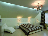 Но вернёмся к самому гостеприимному помещению. Зону отдыха здесь составляет симметрия небольших диванов цвета кофе с молоком, плазменная панель и довольно приземистый столик. Люстра перекликается с бра вдоль лестницы, а подвески на люстре – со шторами. Обои в этой зоне повторяют «лестничные» обои, но отличаются более тёмным оттенком. Подвесные шкафчики визуально облегчают пространство. Живые цветы, расставленные повсюду, добавляют в интерьер природной гармонии.