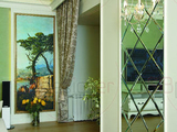 Также организовать пространство в этой парадной комнате помогают художественные включения: симметричные фрески с изображением старинной Флоренции и зеркальные панно, имитирующие французские окна.