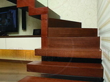 Один из самых ярких и смелых приёмов, который обращает на себя внимание в этой комнате, – расположение лестницы в самом центре гостиной. Выбрав визуально лёгкую конструкцию, дизайнеры сделали её значимым элементом композиции. Подвесная корпусная мебель призвана поддержать это ощущение воздушности и «невесомости» всех элементов. А мягкая группа простого дизайна напоминает о функциональности данного пространства.