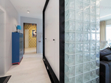 Самым заметным архитектурным элементом общей зоны стала перегородка из стелоблоков. Ее присутствие обусловлено планировочным решением, надо было отделить гардероб от жилой зоны. Делать глухую стенку авторам не хотелось, это бы плохо отразилось на восприятии пространства, которое должно было оставаться свободным, воздушным и не перегруженным. Стеклоблоки стали отличным выбором, и именно в таком объеме этот материал проявил весь свой потенциал. С обратной стороны к стеклянной перегородке примкнул гардероб. Чтобы добиться большего декоративного эффекта, авторы встроили в конструкцию скрытую подсветку — сегодня заказчики включают ее в вечернее время, чтобы создать нужное световое настроение.