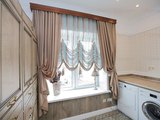 В дизайне интерьера была продумана каждая деталь. Все нацелено на создание романтичной изящной атмосферы. Настроение дома чувствуется уже с порога. Прихожая скорее похожа на будуар – красивая мебель, фреска на стене, пышная люстра и элегантные шторы – все задает стиль.