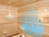 Украшением служит ручная роспись, изображающая корабль. Этот рисунок обращен к зоне отдыха и настраивает мальчишек на покорение новых горизонтов. При этом в мансардном пространстве намерено не создано ощущение «детской территории», этот уровень взрослые могут использовать и как место для встреч с друзьями, и как место для личного отдыха.