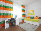 Автор проекта всегда стремится к тому, чтобы вся квартира была выдержана в одном стиле, поэтому детская комната решена в том же архитектурном ключе, что и все пространство. В итоге мы видим абсолютно идентичный подход к оформлению стен и пола, как и во всей квартире. Мебель здесь также не выходит на первый план. Настроение создано за счет ярких картин и текстиля. Когда юный хозяин комнаты повзрослеет, можно будет поменять материалы на более сдержанные и серьезные по цветовой гамме и, таким образом, без глобальных усилий преобразить детскую комнату.