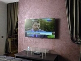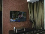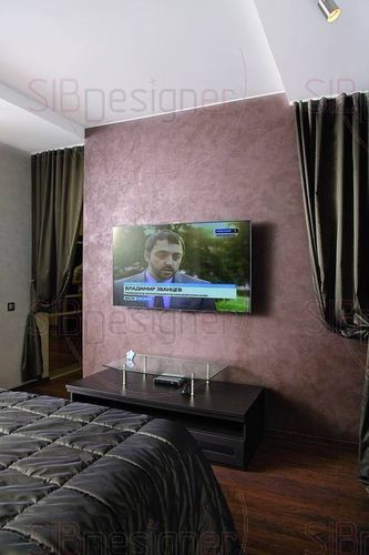 Гостиная воспринимается как отдельная комната. Благодаря тому, что глубокий насыщенный оттенок потолка поддержан выбором чуть более светлых покрытий на стенах и на полу, здесь создана уютная камерная атмосфера.