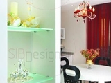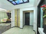 Минуя каменный "город", мы попадаем в холл, являющийся центром квартиры, из которого, словно лепестки цветка, в разные стороны расходятся комнаты. Так как помещение проходное, при его отделке дизайнер руководствовалась принципом «максимум уюта, минимум загромождения». Во встроенном стеллаже с подсветкой хозяева разместили милые сердцу сувениры, и с годами свободного места на полках будет всё меньше. Ниша с часами и отделкой из камня является символом вечности, подчёркнутым витражом на потолке, который навсегда останется вне времени и моды.