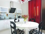Благородные цвета и фактуры, броский дизайн предметов интерьера делают из современной кухни образец ар-деко. Роскошная обстановка создаётся здесь благодаря обеденной группе – белоснежному столу и чёрно-белым стульям: округлые и изогнутые формы, отражающийся в глянце свет, узор на сидениях. Дополнительно акцентирует внимание на этой зоне люстра из металла и красного стекла, с которой гармонично сочетается участок стены алого цвета и тюль на окне. Не стоит забывать, что, помогая расставить акценты в интерьере, красный цвет ещё и пробуждает аппетит.