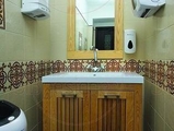 Так, наряду с классическими обоями с дамасским узором, панно из зеркальных полотен с фацетами, лепниной и коваными светильниками мы встретим на стенах имитацию кирпичной кладки – нарочито грубая фактура подчёркнута при помощи обычной штукатурки. В залах кофейни дорогие кожаные диваны, стеганные в классической технике, соседствуют с простыми деревянными стульями в духе ретро. Такое сочетание противоположностей – не единственный неожиданный приём. Поверхность потолка оклеена обоями! Внимательные наблюдатели заметят, что узор на них «переведён» с других обоев – тех, которыми декорирована часть стен. В сочетании с довольно тёмным полом такое оформление позволило создать уютную камерную, но не довлеющую атмосферу.