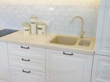Светлые филенчатые фасады кухни выглядят воздушно и легко, фартук отделан керамической плиткой формата кирпича, по своему оттенку материал вторит цвету мебели. Глянцевая поверхность плитки «играет» еще и за счет подсветки. Точечные светильники на потолке дают направленный свет на рабочую зону, а также делают световой акцент на поверхности фасадов.