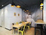 Границы кухонного пространства, где сотрудники могут пообедать или отдохнуть, выпив чашечку кофе, раздвинуты за счет обоев с изображением перспективы. Вся мебель здесь поддерживает концепцию стиля лофт. Кухня выполнена в актуальном планировочном решении: вместо верхнего яруса шкафов – открытые полки, на которых разместился декор. Пол уложен керамической плиткой, имитирующей паркетную доску.