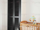 Небольшой встроенный шкаф выполнен с деревянными дверями-жалюзи, которые по тону вторят кровати.