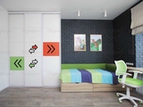 Дизайн детской комнаты Дарья создавала «на вырост». По характеру комната мужская, но это начало дополняют яркие акценты, свойственные юному возрасту хозяина: забавная графика на фасадах шкафа в виде указателей движения, постеры с изображением динозавров над кроватью, цветное покрывало и ящики в стеллаже. Основной фон стен – антрацитовый, «разбитый» фактурной кладкой декоративного кирпича. Стоит со временем изменить акценты – и комната приобретет совершенно другой, более серьезный облик.