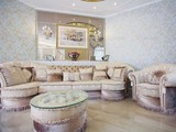 В интерьере гостиной, чтобы сгладить влияние угла, использованы мотивы круга. Круглый витраж в обрамлении точечных светильников и молдинга, полукруглый диван и круглый столик, радиальная перегородка, в дизайне потолка над столовой группой также присутствует эта форма.
