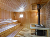 Действующий камин, отделанный массивом сосны и мозаичной плиткой из натурального камня, служит своеобразным продолжением банной печи. Проём в стене, отделяющий парилку от гостевой зоны, позволил совместить отопительные функции печи в сауне и эстетические в гостевой комнате. Парилка выполнена по всем славянским канонам, а в ее интерьере прослеживается орнамент задуманного автором стиля.