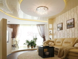 Как уже говорилось выше, интерьер просторной квартиры получился очень теплым и уютным. Такого обволакивающего эффекта удалось добиться за счет использования различных текстур одного оттенка - от мебели до декоративной штукатурки и обоев, которые словно перетекают и растворяются друг в друге. Вся эта невесомость, впрочем, имеет в основе вполне осязаемое проектное обоснование и точный расчет. При создании интерьера Елена Горбунова старалась эффективно задействовать каждый метр и по–максимуму использовать главное украшение квартиры - панорамный вид из окон в гостиной. Хозяева выразили пожелание объединить в одно пространство гостиную, кухню и столовую.