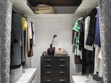 Интерьер спальни практически монохромный. Ряд постеров над изголовьем и подвесные светильники выстраивают ритм вертикалей, разбивая объем белой стены. Интерьер при своей строгой гамме и графичности производит впечатление уютного, он смягчен мягким ковролином, декоративной подушкой из меха и декоров в виде перьев. Все это тонко оказывает влияние на визуальное восприятие.