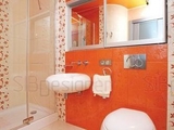 Спальня взрослых реализована в столь же активной гамме, что и первый уровень квартиры.Доминирующий активный цвет здесь играет оранжевый. Для отделки стен авторы проекта выбрали декоративную штукатурку, из нее же создан и орнамент, украшающий изголовье кровати, ниши и часть зеркальной стены. Идея вновь закручена вокруг округлых форм, и даже кровать имеет необычную радиусную основу. Однако на потолке конструкции уже прямоугольные, простые, но это в поддержку перегородке, отделяющей спальню от неотапливаемой лоджии.