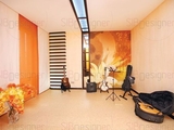 Спальня двадцатилетней девушки сегодня служит музыкальной комнатой, так как ее хозяйка учится и живет в другом городе. Эта комната отличается по стилистике: здесь угадываются мотивы японского минимализма. Они прослеживаются в лаконичных строгих нишах, декоративной витражной конструкции, переходящей со стены на потолок, а также текстильных японских панелях, которыми украшено окно.