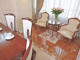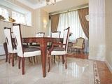 Украшением столовой зоны является мебельная группа с элегантными стульями и шикарным столом из натурального дерева. Пол здесь выложен похожим на мрамор керамогранитом наподобие ковра. В небольшом эркере расположились кофейные кресла и небольшой столик.