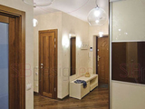 Последний пункт оказался одним из самых сложных, если учесть, что по общему плану строения квартира находится на угловом стыке секций радиусного дома, вследствие чего имеет ломаную конфигурацию, которую невозможно изменить из-за наличия несущих стен. Одной из интересных задач дизайнер считает работу над коридором. В данном объекте он слишком большой; нужно было придумать, как извлечь практическую пользу из дополнительного метража. Глубину коридора было решено уменьшить за счет вместительного шкафа-купе, а светлые стены оживить одинаковой по цвету, но разной по фактуре декоративной штукатуркой. Приковывают взгляд потолочные стеклянные шарообразные светильники: огромные в большом коридоре, маленькие в малых коридорчиках, они обеспечивают прихожую достаточным количеством света и при этом совершенно не утяжеляют пространство. Часть коридора возле входной двери грамотно оборудована мебелью: невысокая тумба служит одновременно и подставкой для сумок, и скамейкой, внутри которой удобно хранить обувь.
