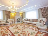 Телевизионная зона довольно лаконична, но в тоже время не противоречит общему стилю помещения. Оконный текстиль с портьерами, украшенными кистями, соответствует классическому настрою. На полу в центральной части комнаты – шерстяной ковер. Стены комнаты отделаны декоративной штукатуркой, а от камина к лестнице нижняя часть стены декорирована деревянными панелями.