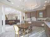 Мы говорили, что классика здесь присутствует в ее облегченном варианте. Примером тому служит дизайн кухонного гарнитура. Он выглядит довольно лаконично в сравнении с традиционными кухонными ансамблями в классическом стиле. Для фасадов выбрано нестандартное цветовое решение. В отличие от традиционных темных или бежевых тонов здесь использован холодный серо-коричневый оттенок. Объединяющим элементом между гостиной и кухней служит декор потолков с использованием молдингов и симметричное расположение люстр.