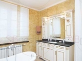 Ванная комната, предназначенная для хозяев дома, представляет собой довольно просторное помещение. За стеклянной перегородкой скрывается душевая, оформленная мозаикой темно-коричневых оттенков. Аксессуары, выполненные из золоченого металла, патина на фасадах мебели с оттенком золота, классические люстры с обилием декора – все здесь подобрано для создания утонченной обстановки.
