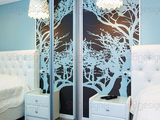 Особенное значение в этом интерьере играют визуальные образы деревьев, присутствующие на стенах в общественной зоне и спальне. Это рукотворные оригинальные росписи, которые сделала сама Юлиана, автор проекта. Такие образы вносят природное начало в проект, делают его живым, динамичным и выразительным.