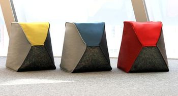 Сами пуфы PP Capsule имеют форму усеченной пирамиды, что позволяет добиться их большей устойчивости. Яркие чехлы сшиты из плотного трикотажа и плотной полупрозрачной синтетической сетки (таким образом, пестрое крышечное «конфетти» виднеется сквозь материал).